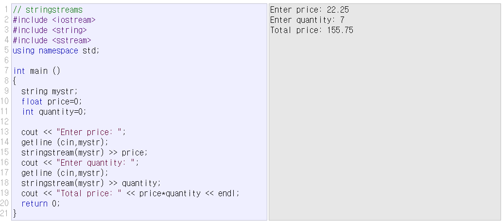 이 예제에서는, 우리는 스탠다드 인풋으로부터 숫자 값을 간접적으로 얻어볼 것이다: cin으로부터 숫자 값을 바로 추출하는 대신, 우리는 스트링 요소인 mystr으로 부터 줄을 읽고, 그 뒤에 우리는 해당 스트링에서 그 값을 추출하여 price와 quantity에 넣게 된다. 이것들은 숫자 값이기 때문에, 곱하기와 같은 산술 연산이 가능하다.